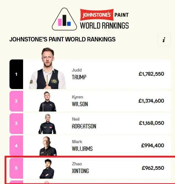 北京时间3月2日,世界斯诺克巡回赛(WST)公布威尔士公开赛后最新世界排名:28岁中国选手赵心童以962550英镑积分稳居世界第5位,不仅单杆破百数位列中国选手第一,在年度榜单中同样位居中国选手榜首,一举刷新个人职业生涯最高排名纪录!